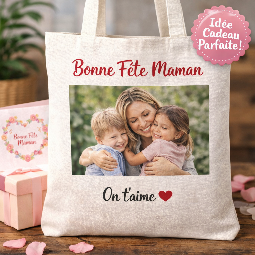 Tote bag personnalisé Fête des Mères – Photo & message – Cadeau unique maman ❤️